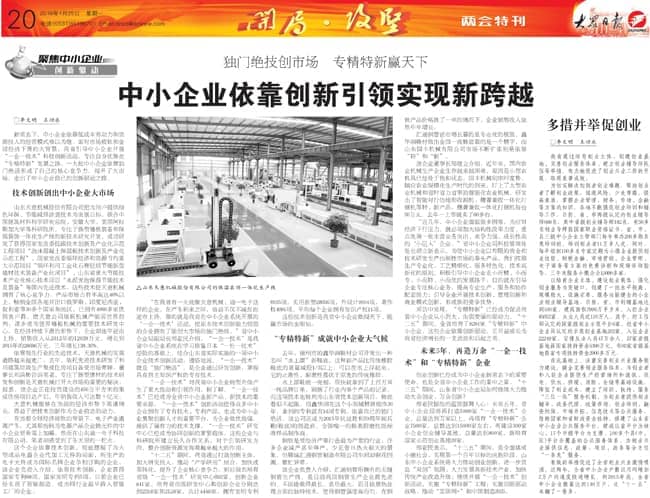 2015年1月25日的大眾日報(bào)?兩會特刊《獨(dú)門絕技創(chuàng)市場 專精特新贏天下――中小企業(yè)依靠創(chuàng)新引領(lǐng)實(shí)現(xiàn)新跨越》重點(diǎn)介紹了我公司技術(shù)創(chuàng)新的經(jīng)驗(yàn),敬請關(guān)注。